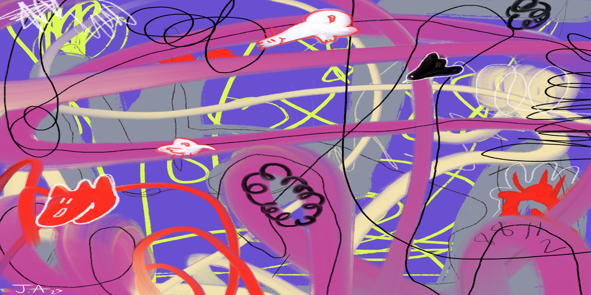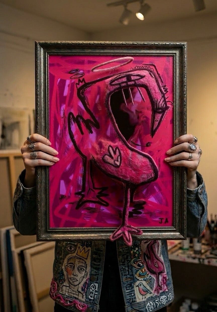 Distortion functions as an act of honesty. Fragmented figures, layered surfaces, and bold color contrasts reveal the complexity of inner dialogue without attempting to resolve it.