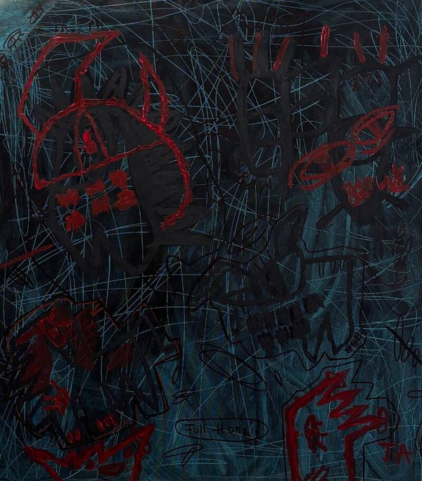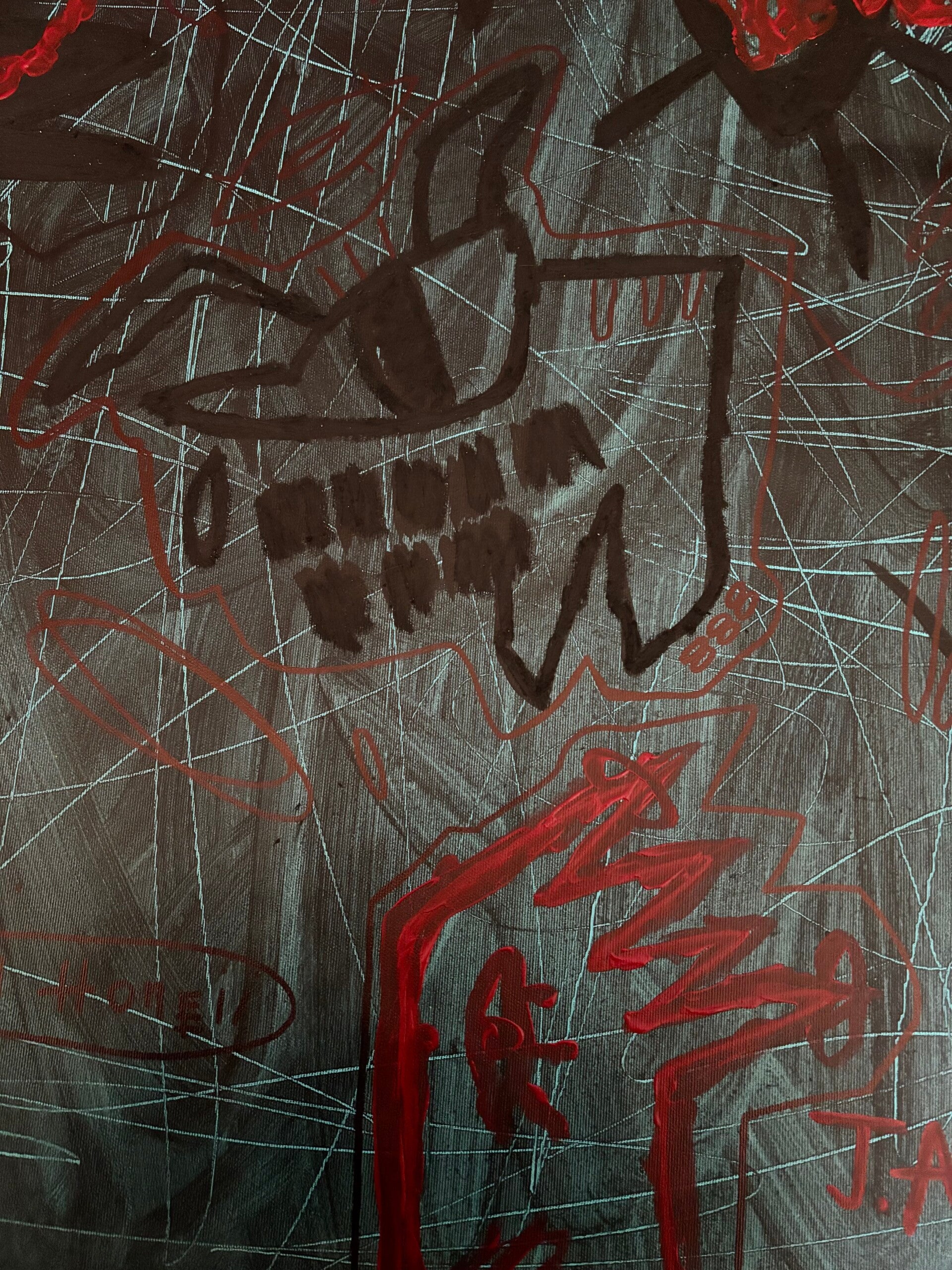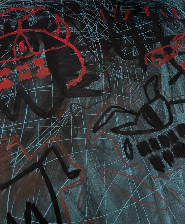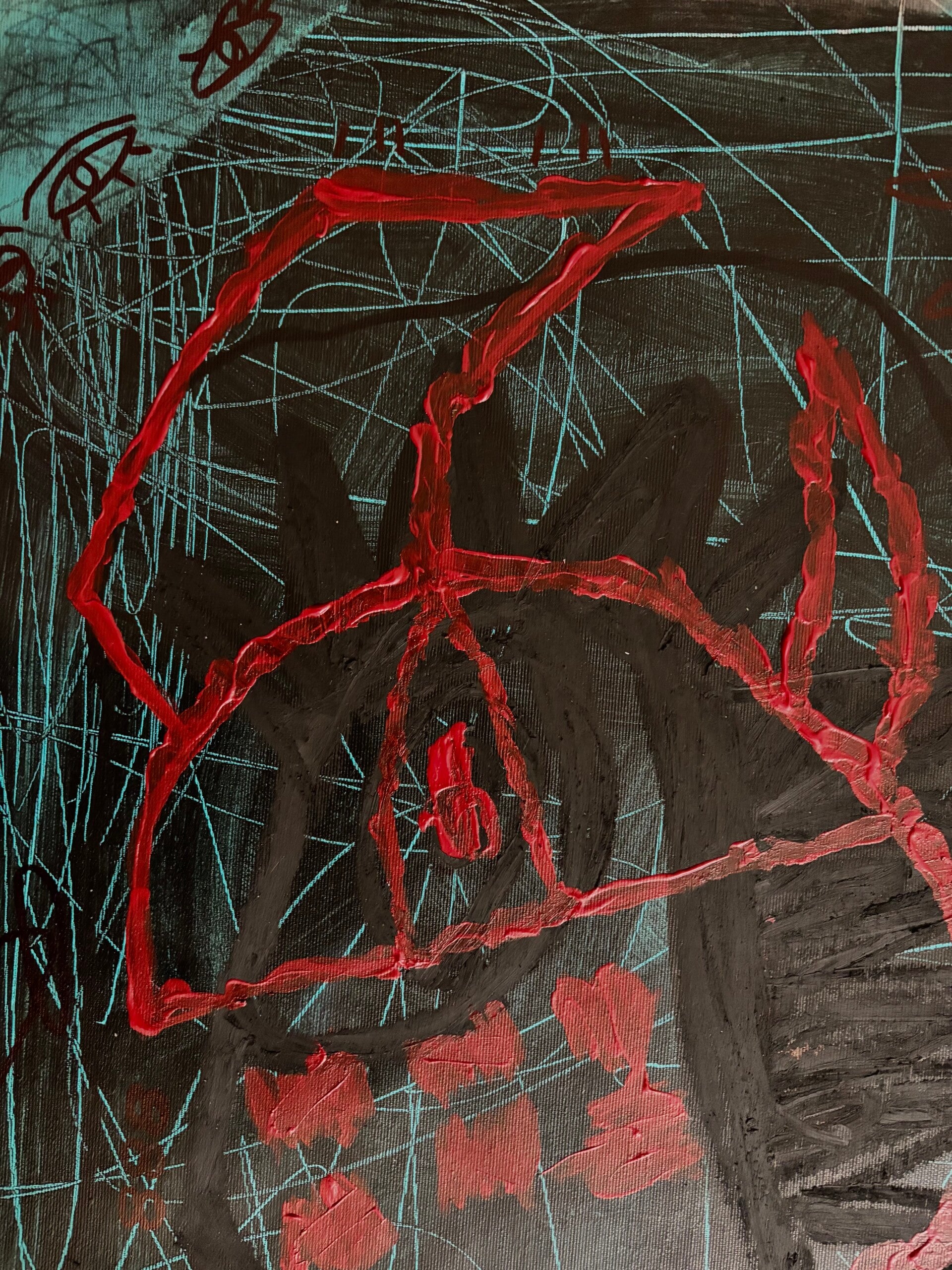 The red hands at the base of the composition externalize the grip of anxiety. What is often internal and invisible becomes confrontational and visible. By giving fear form, I remove its secrecy.